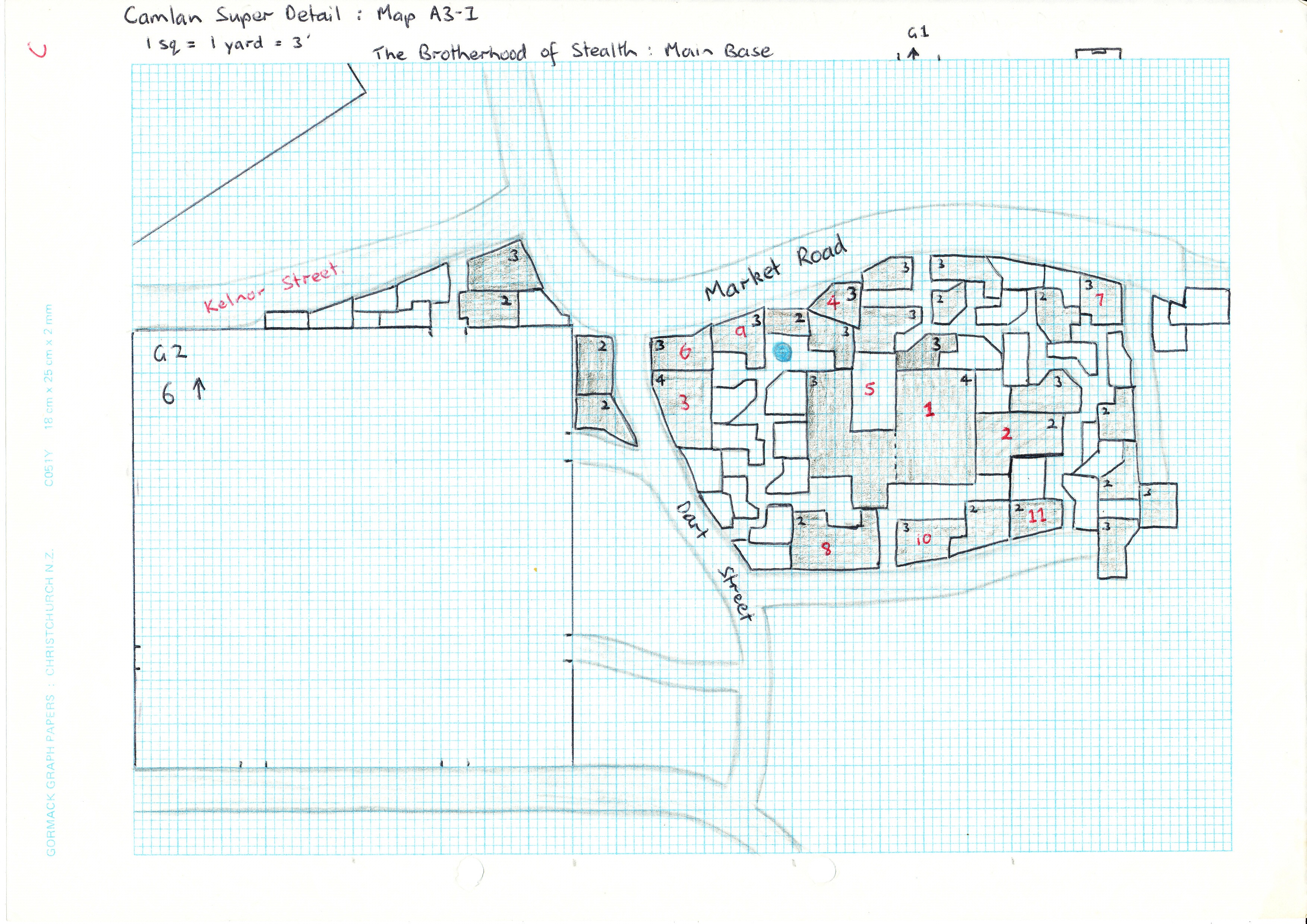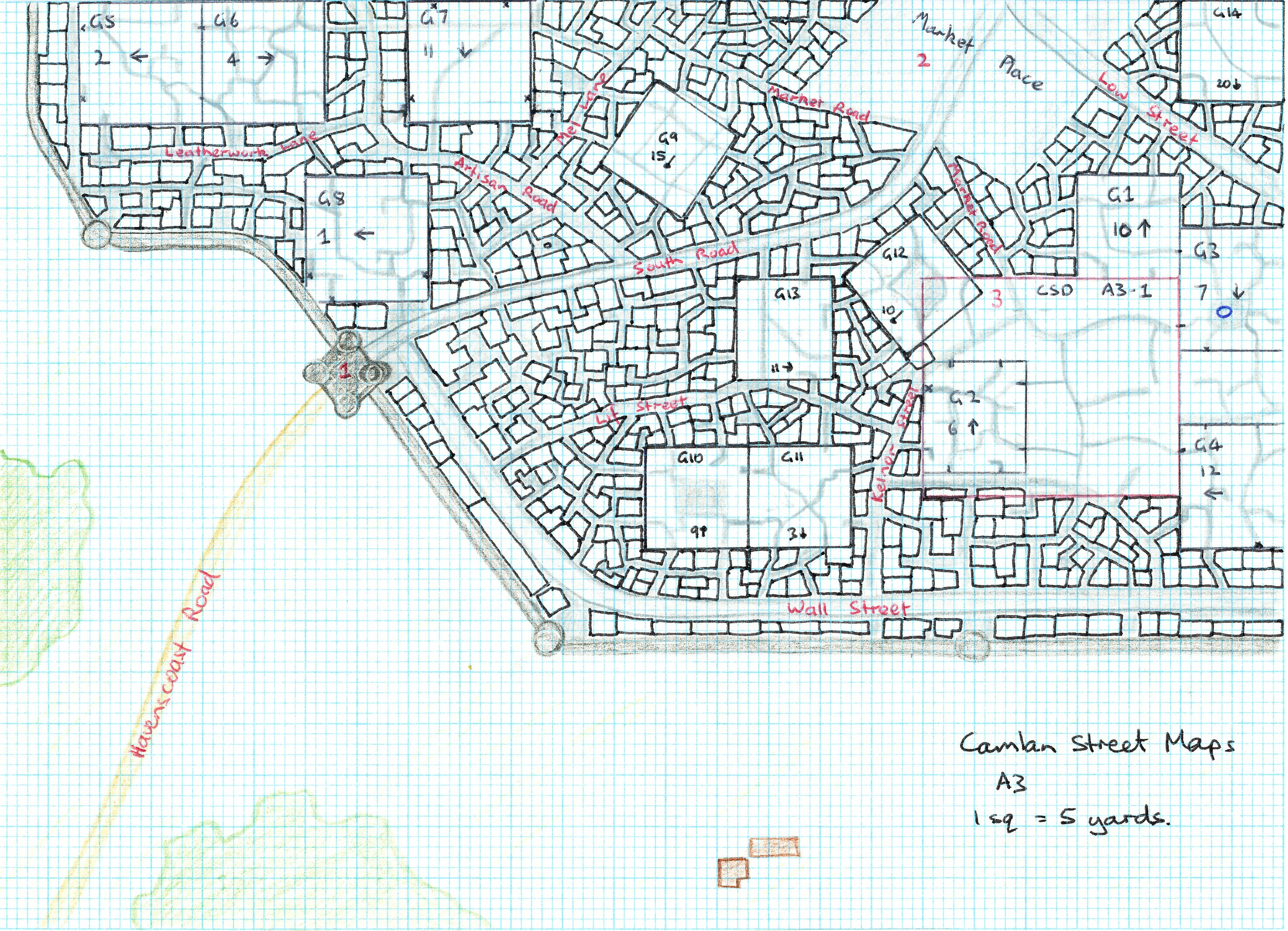 This part finished map shows a small part of the city in great detail – in this case a whole block that is the main base of the ‘Brotherhood of Stealth’, the powerful thieves’ guild of Camlan.      City Geomorph: