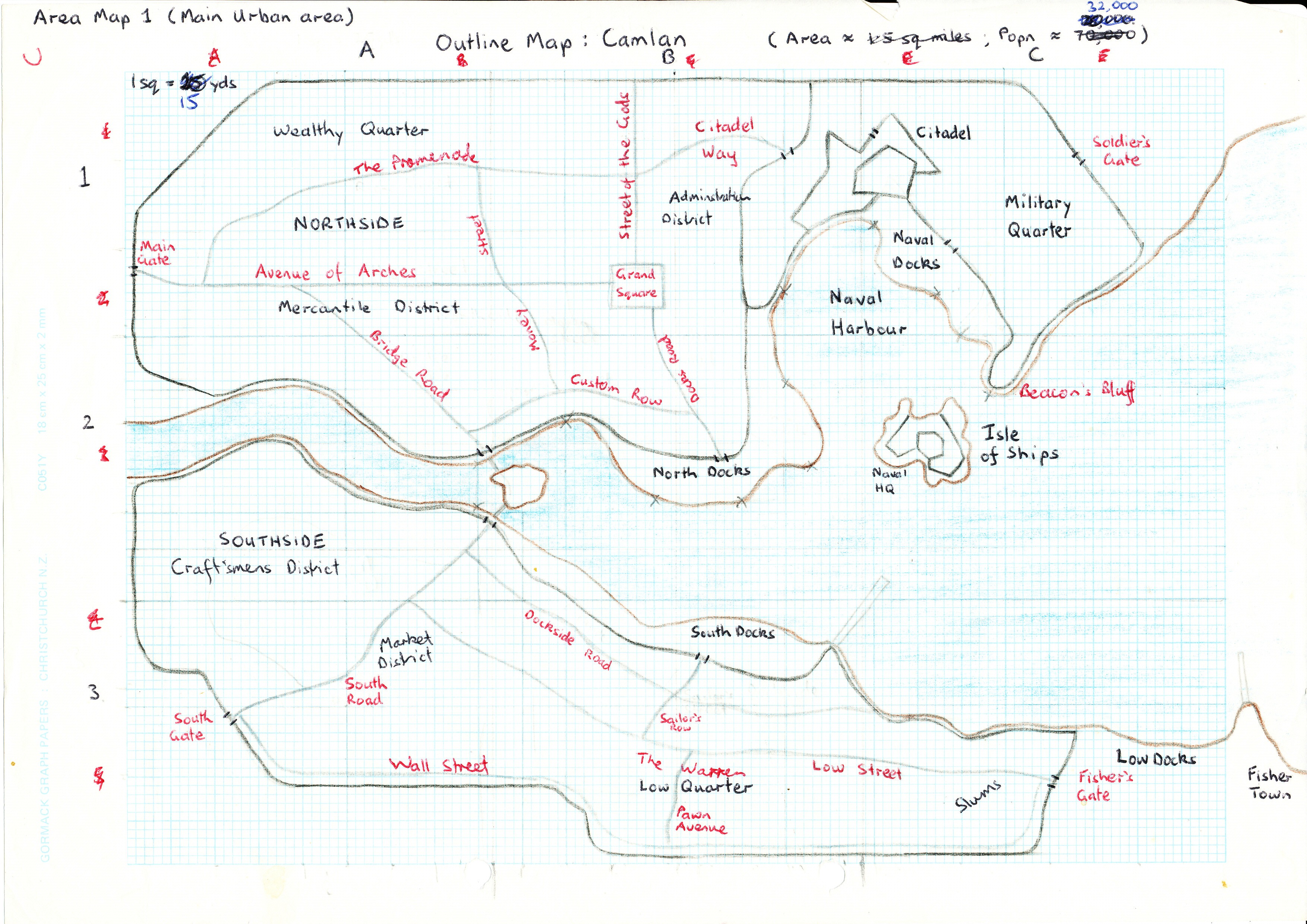 This map shows the whole of Camlan city, labelling the key districts and landmarks. Further detail is broken down into 4 Urban Street maps, due to the size of the city.