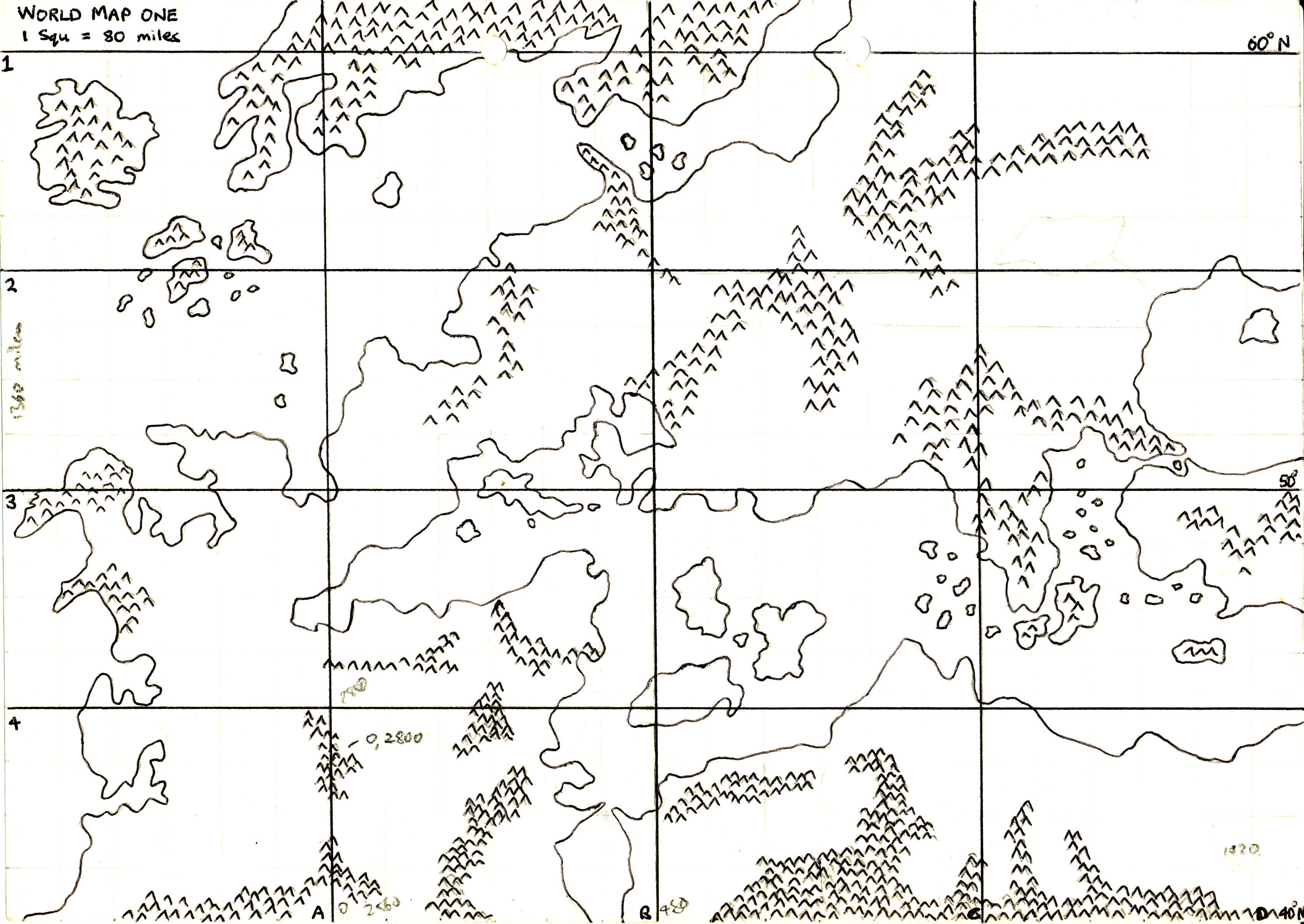 The intial world map of Tolrendor. It’s a bit hard to see the grid lines (i.e. 80 square mile grid), but you can clearly see the Area Map grid reference.