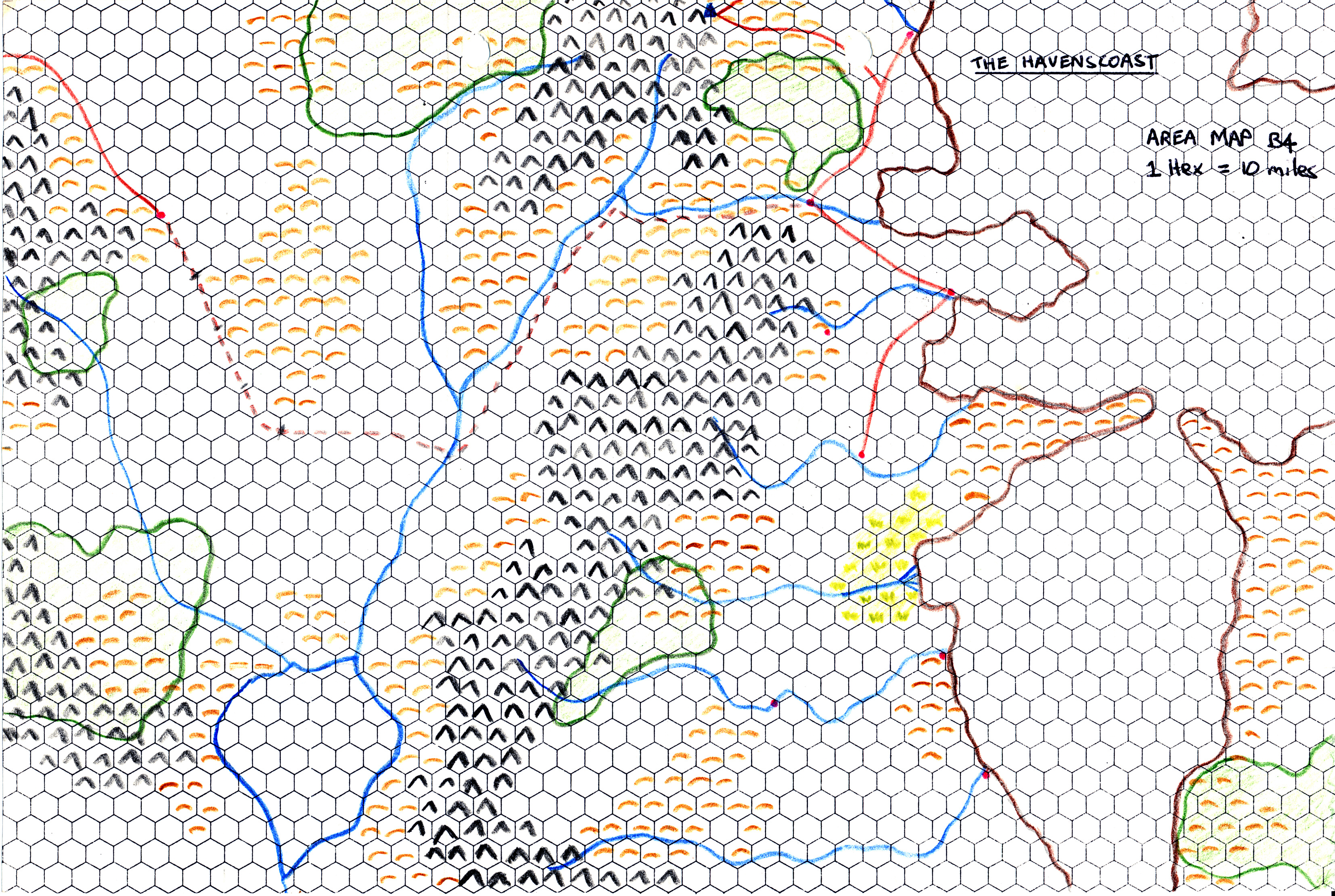 An original hex Area Map D4 – one of the key campaign areas of my long-running solo campaign. It shows my typical simple icon based style using colour pencils.