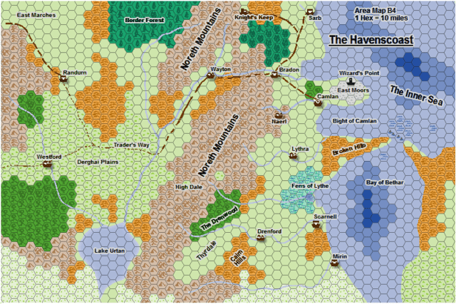 As with most of my D&D creations, it all starts with a MAP! So here is one I prepared earlier (i.e. for the background of the site), a re-creation of my original hand-drawn Area Map B4, using a Hex style in CC3: