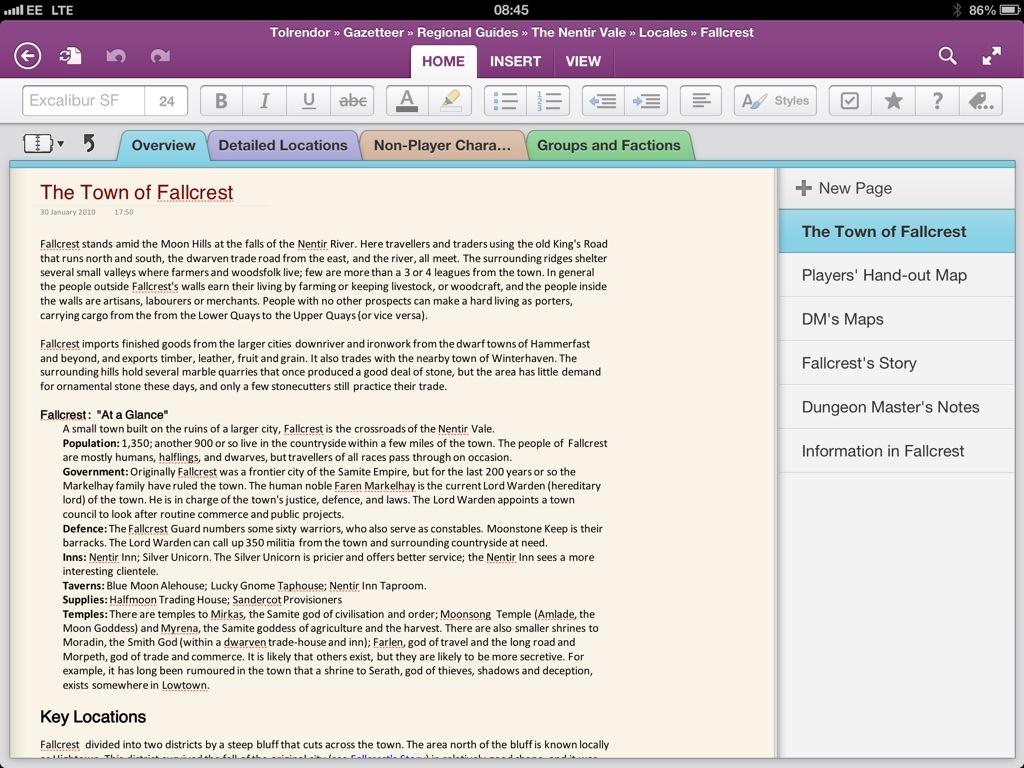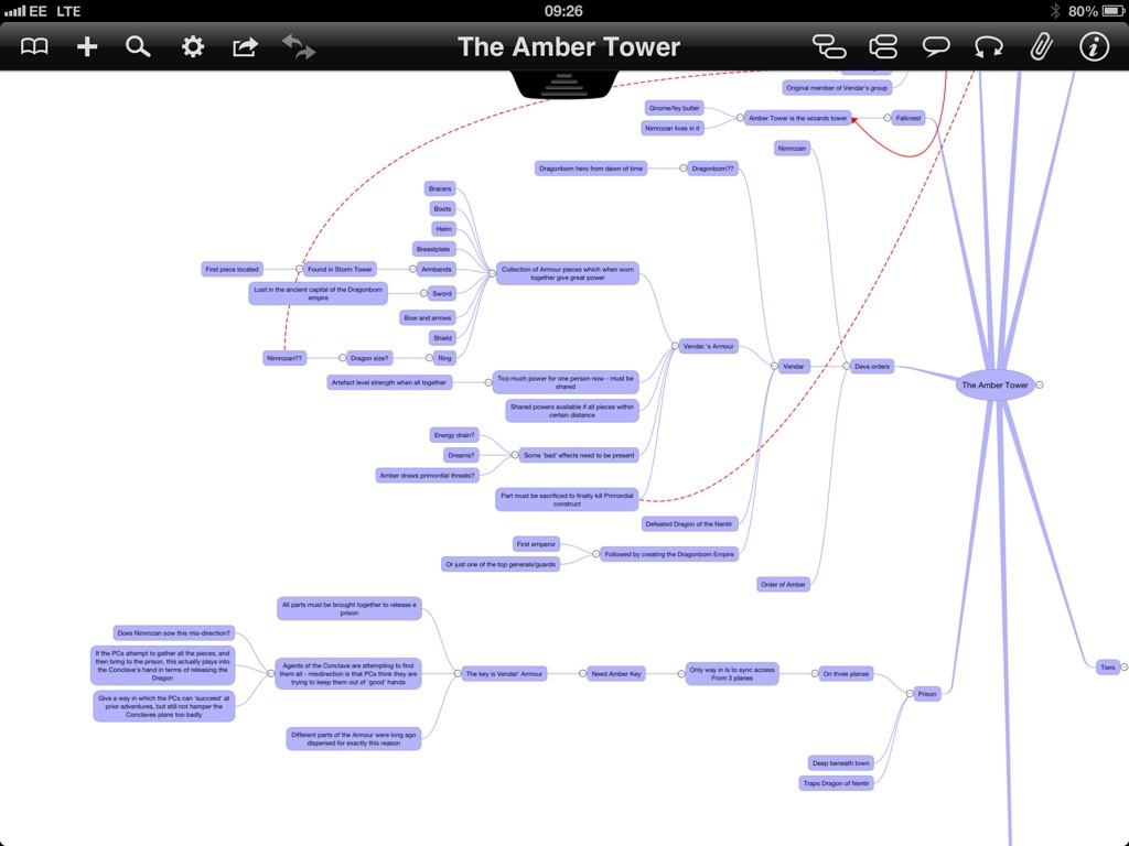 I also try and do most of my creative thinking on the train, as this maximises my time at home on a PC for more complex prep such as creating maps using CC3. For this process, I’ve been using a iPad mind-mapping app called iThoughtsHD. This allows me to brainstorm effectively, just popping out ideas and jotting them down in a connected way. Later, I can review those ideas, select the ones I like best, and start to build them into more structured notes (at which point I use OneNote). This app can also share data with a PC-based app, although I’ve never bothered with this – after brainstorming on my iPad, I simply transpose the ideas into OneNote.
