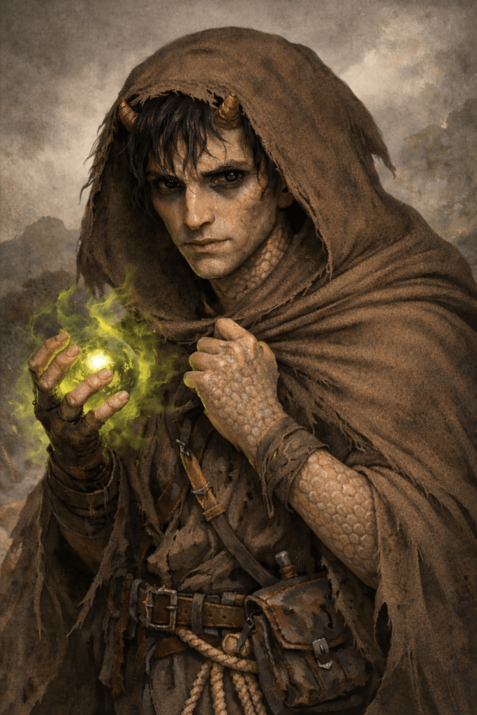 It began as accidents — heat blooming in his palms, sparks leaping when fear took him, shadows twitching when he was angry. On the streets, latent power without control is just another way to die. Tarin was already marked as an outcast by his horns and vestigial wings; random bursts of sorcery only made him more noticeable, more dangerous to keep around.