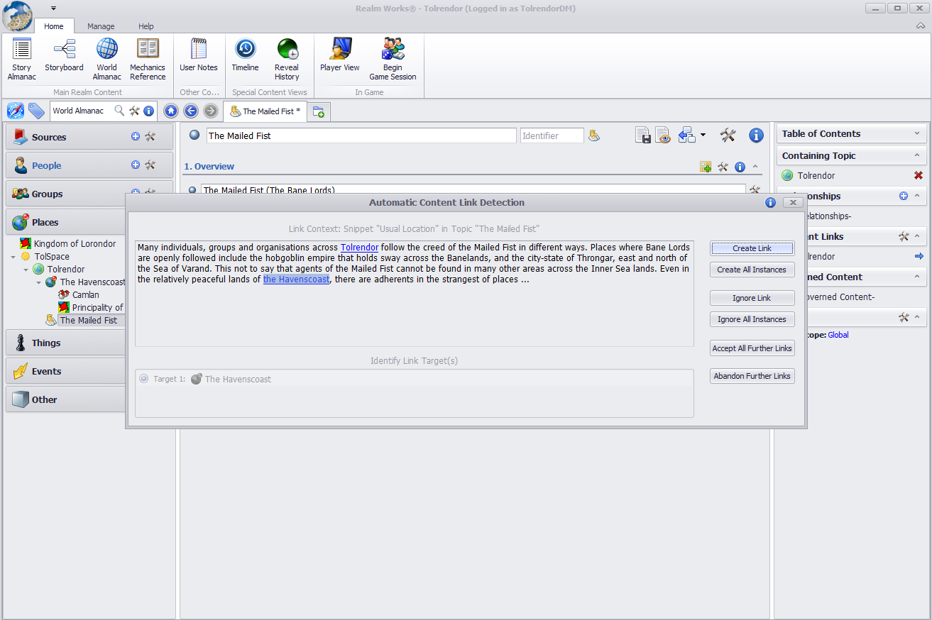e editing text in a topic, as soon as you hit the ‘Save’ button, Realm Works automatically scans your text to determine if any of the words you’ve used match other topics, and will ask you to confirm if you want to create links to these topics. I mean, why wouldn’t you! This is so much easier than specifically creating links yourself, and it works pretty fast as well – you’re certainly not sitting there twiddling your thumbs while it churns through your database looking for hits! Maybe this will slow down as the size of your world data increases, but in general this is very usable.